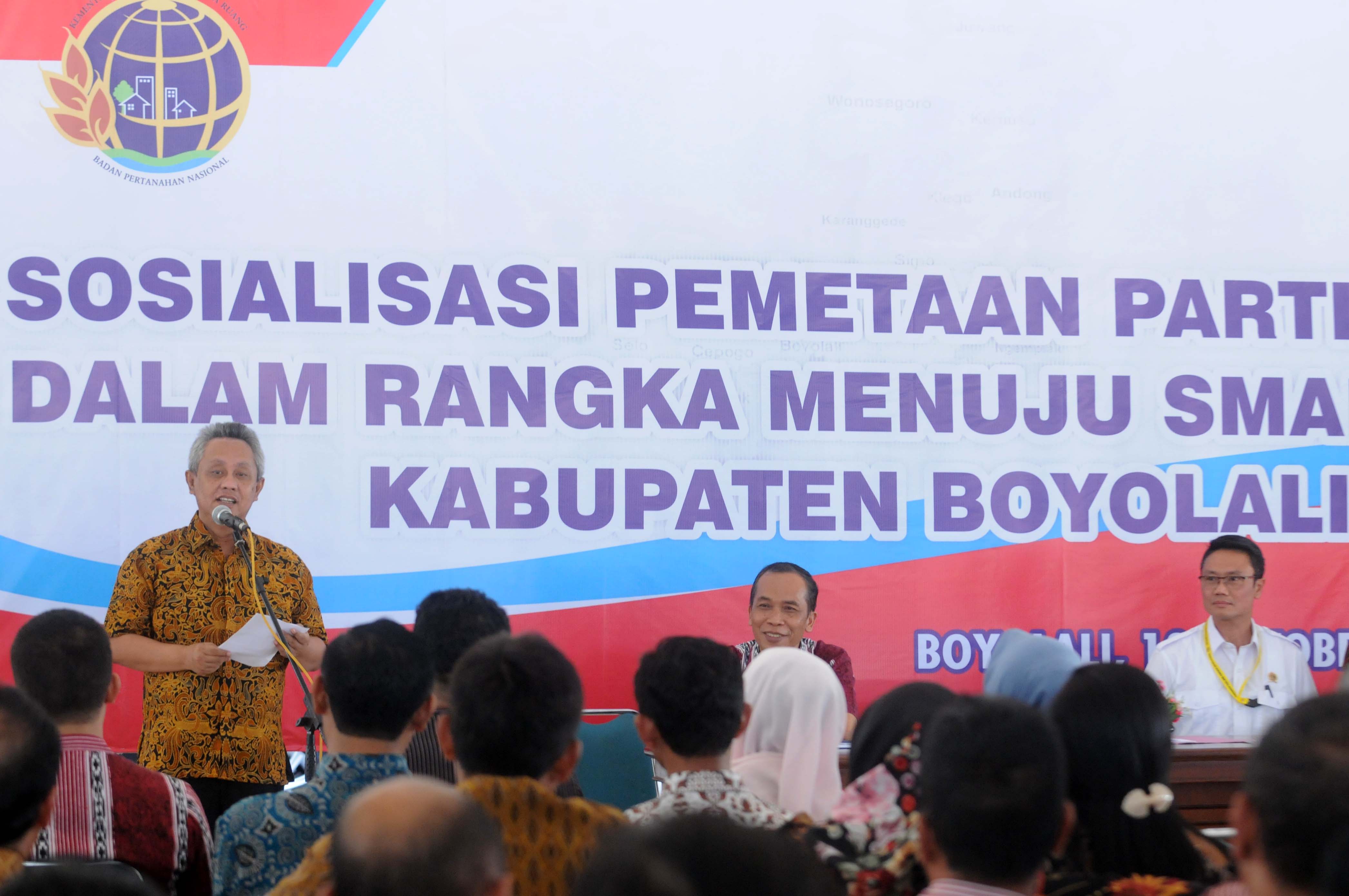 BOYOLALI – Dalam rangka mendukung program smart city Boyolali, seluruh Desa/Kelurahan di Boyolali akan segera memiliki peta bidang partisipatif. Peta berdasar bidang ini dipastikan yang pertama di Indonesia dalam mendukung One Map Policy atau Kebijakan Satu Peta. Hal tersebut disampaikan Kepala Seksi Survei dan Pemetaan Tematik Kantor Wilayah ATR/BPN Provinsi Jawa Tengah, Mansur Fahmi dalam acara sosialisasi Pemetaan Patisipatif di Pendopo Gede Boyolali pada Rabu (10/10) siang.
