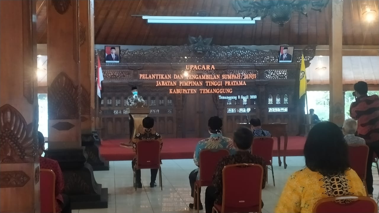 TEMANGGUNG – Bupati Temanggung, Al Khadziq melantik 2 pejabat yang akan menduduki Jabatan Pimpinan Tinggi (JPT) Pratama di lingkungan Pemerintah Kabupaten Temanggung, di Pendopo Pengayoman Temanggung, Rabu (8/4/2020). Kedua pejabat tinggi pratama tersebut mengisi dua posisi yang kosong, yaitu C Masrik Amin Zuhdi sebagai Asisten Perekonomian dan Pembangunan, dan Kristi Widodo (Asisten Administrasi).