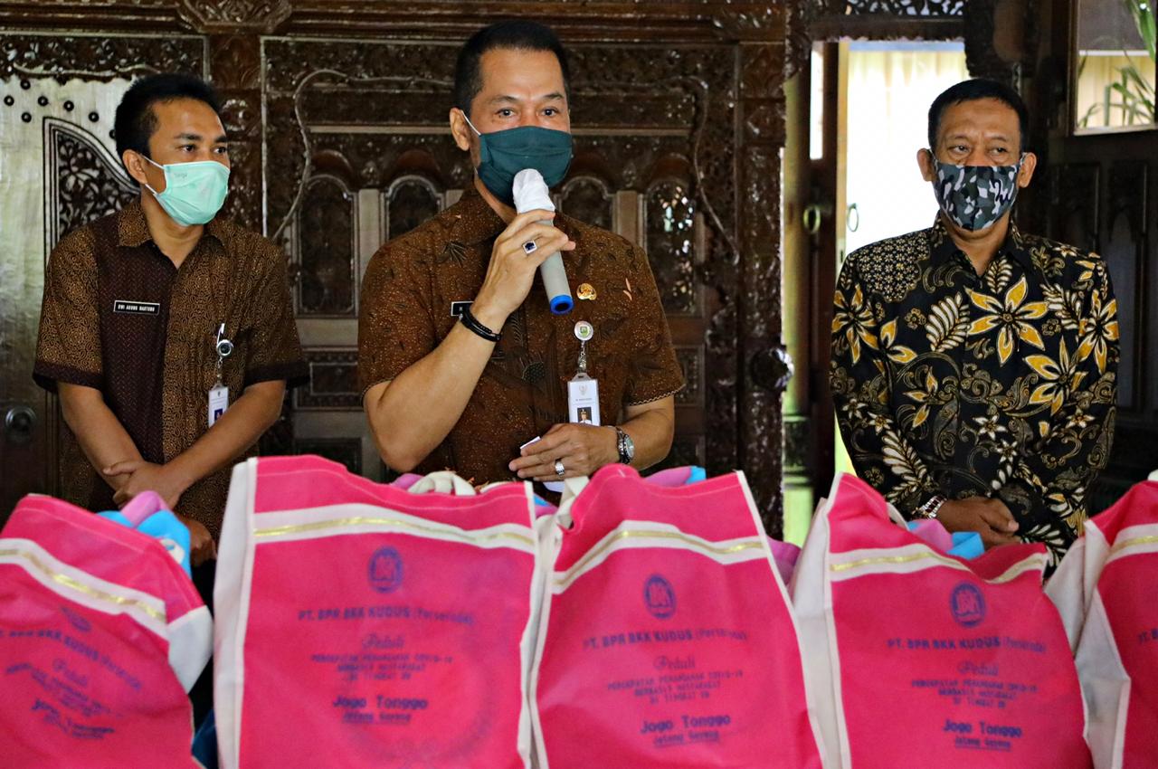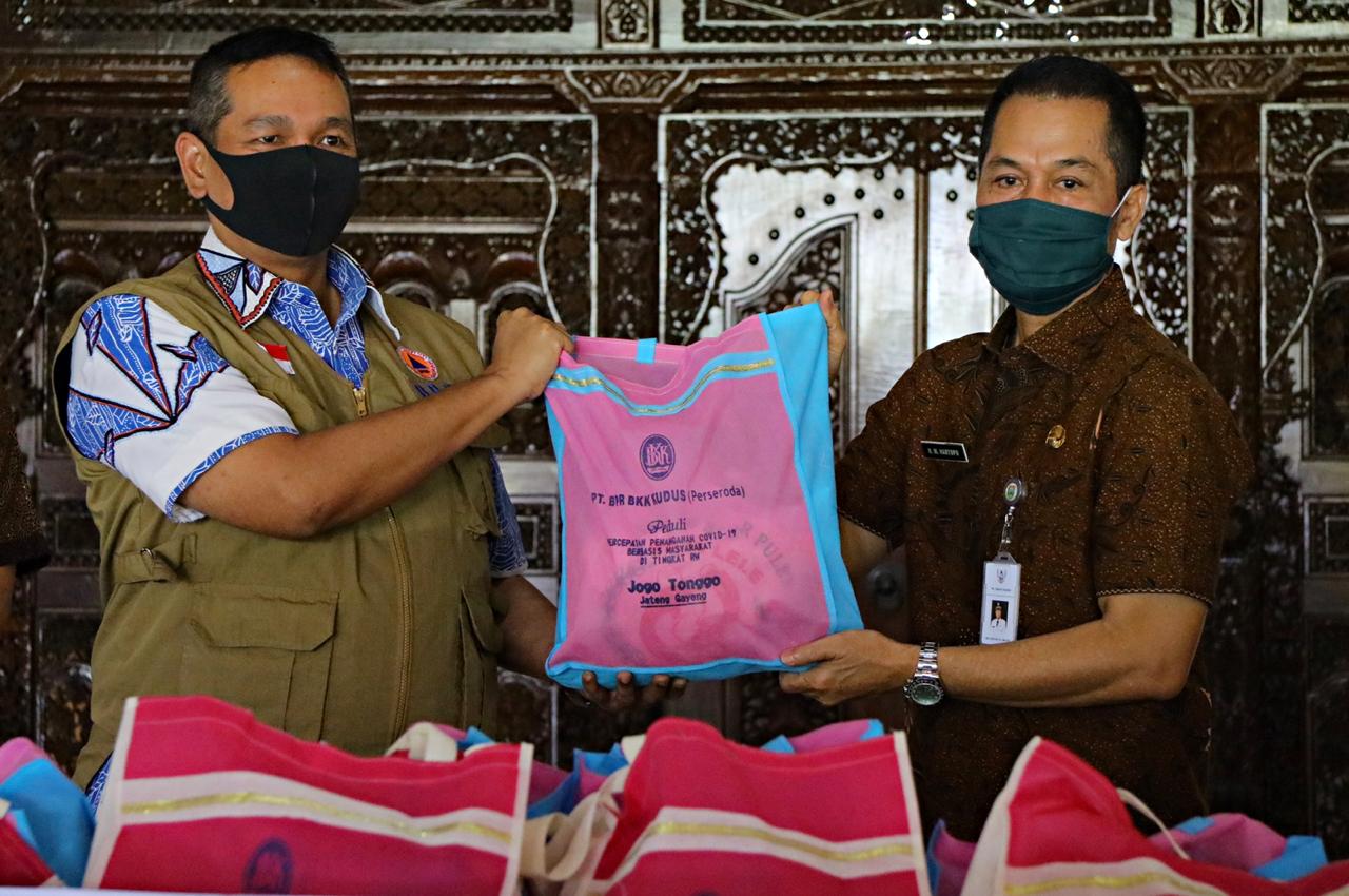 KUDUS – Bantuan untuk masyarakat terdampak Covid-19 terus mengalir dari berbagai pihak. Kali ini, Perusahaan Daerah Bank Perkreditan Rakyat Badan Kredit Kecamatan (PD BPR BKK) Kudus memberikan bantuan berupa 500 paket sembako, berisi beras, minyak goreng, dan mi instan. Bantuan tersebut diserahkan oleh Direktur Utama PD BPR BKK Kudus Noor Mastiko kepada Pelaksana Tuga (Plt) Bupati Kudus HM Hartopo di Pendapa Kabupaten Kudus, Selasa (19/5/2020).