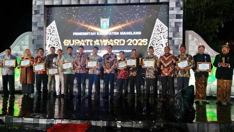 MAGELANG – Sembilan warga dan dua pemerintah desa menerima Bupati Magelang Awards 2025 atas inovasi dan kontribusi mereka bagi masyarakat. Penghargaan diserahkan Bupati Magelang Grengseng Pamuji di Balkondes Tuk Songo, Borobudur, Senin (10/11/2025) malam.