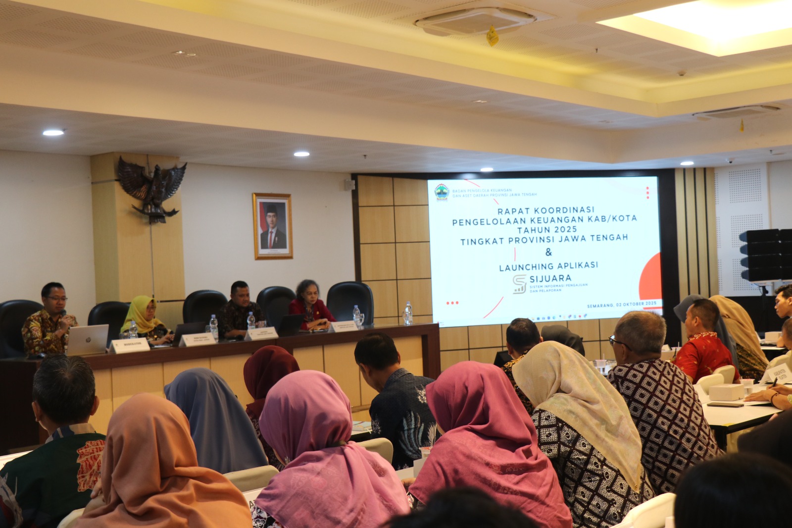 SEMARANG – Badan Pengelola Keuangan dan Aset Daerah (BPKAD) Provinsi Jawa Tengah meluncurkan Sistem Informasi Pengajuan dan Pelaporan (SiJuara), pada Rapat Koordinasi Pengelolaan Keuangan Kabupaten/ Kota, di Gedung Merah Putih BPKAD Provinsi Jawa Tengah, Kamis (2/10/2025).