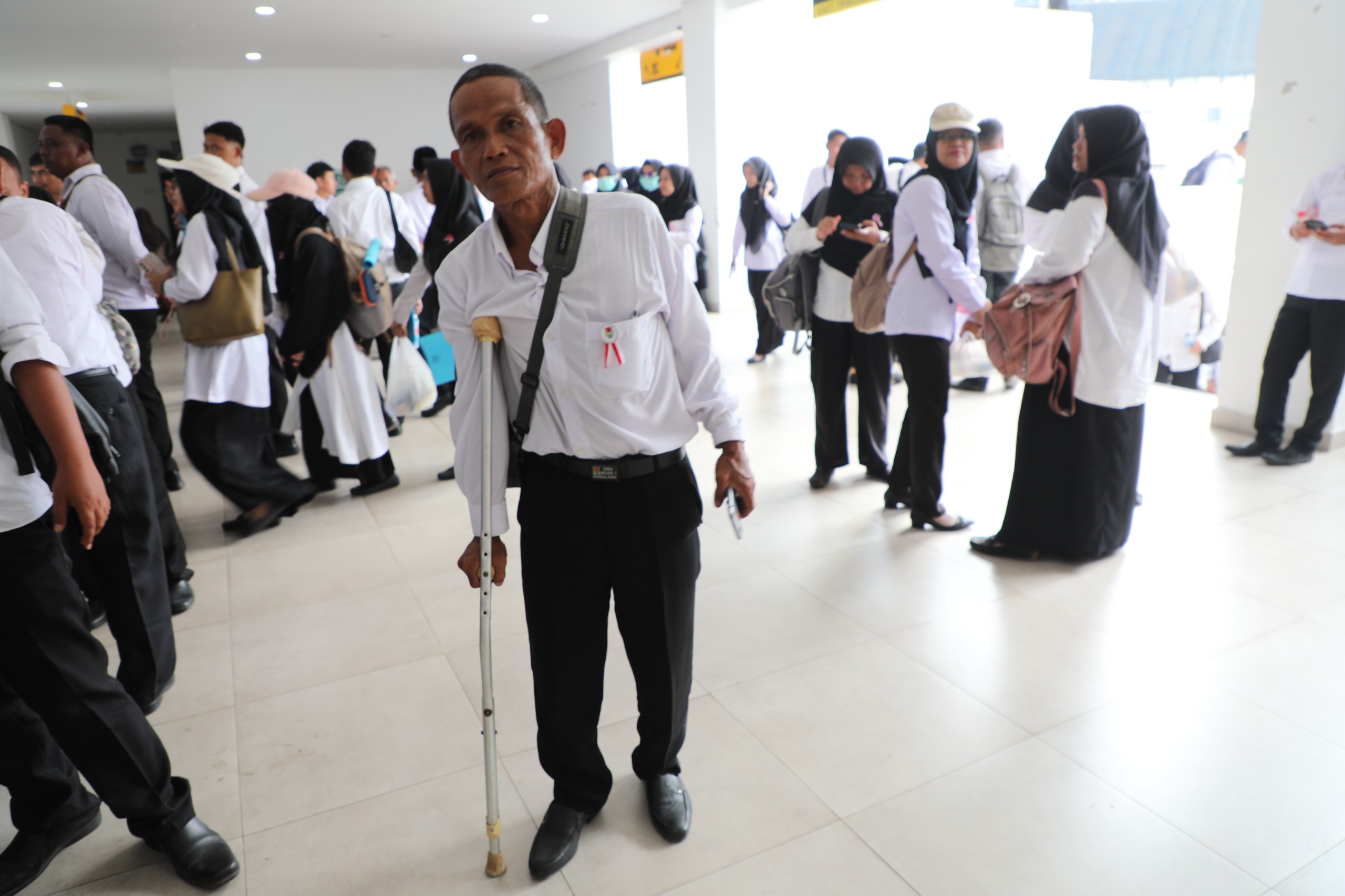 SEMARANG — Senyum tak pernah lepas dari wajah Mulyadi, penyandang disabilitas yang sudah 15 tahun menjadi petugas kebersihan di SMA Negeri 1 Pemalang. Penantiannya yang begitu panjang akhirnya terbayar, saat dia menggenggam Surat Keputusan (SK) Pegawai Pemerintah dengan Perjanjian Kerja (PPPK) Paruh Waktu, di Stadion Jatidiri, Semarang, Kamis (11/12/2025).